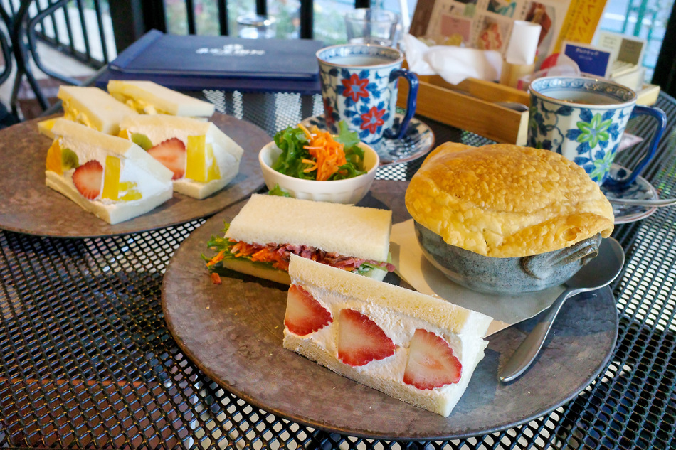 (↓ 私は季節限定プレート、主人はフルーツサンドと卵サンドのハーフ&ハーフ)