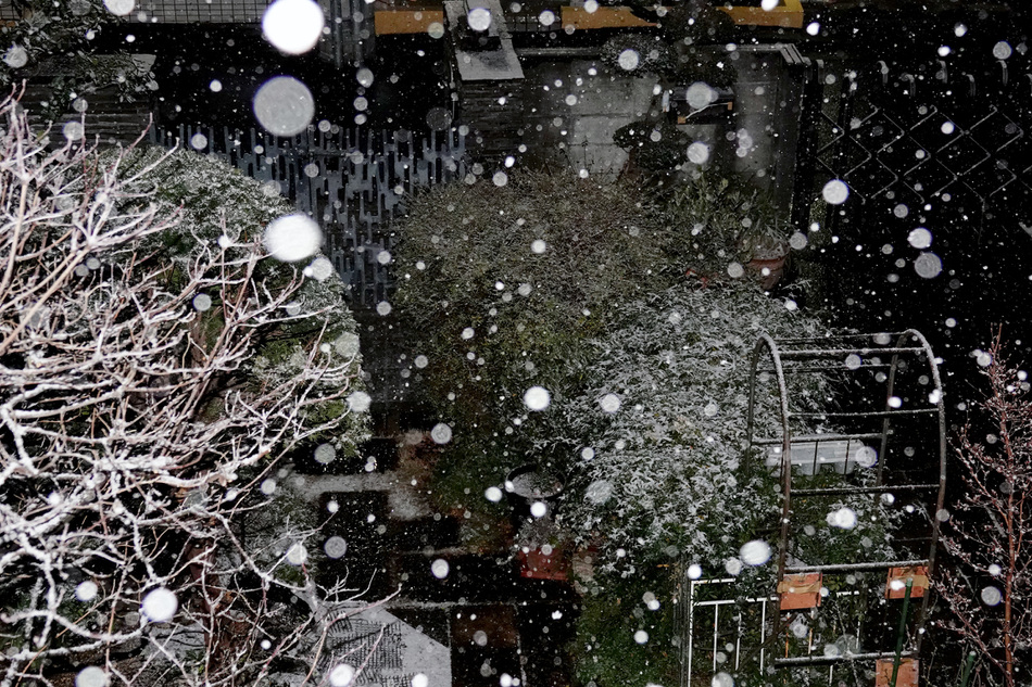 (↓午前2時頃。ベランダから庭を見下ろすが、まだそれほど積もっていない)