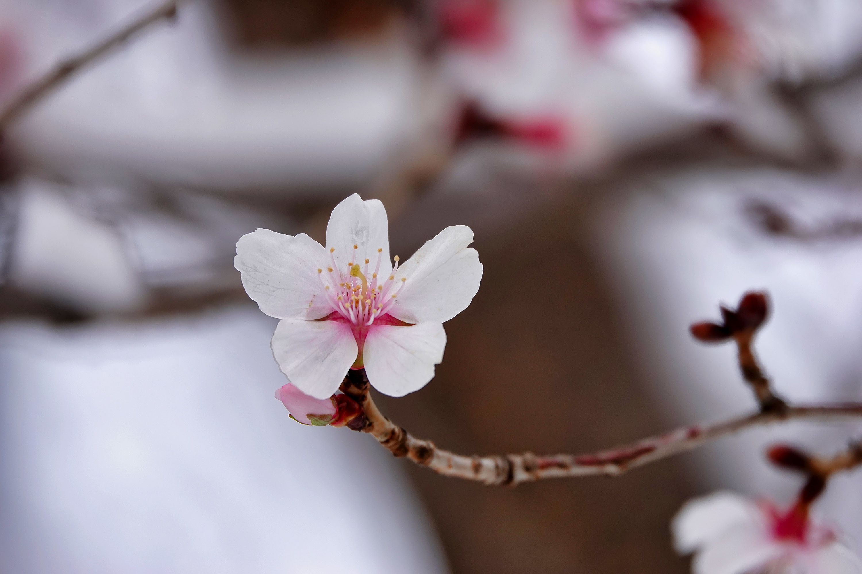 午後2時過ぎには雪もあがり、買い物がてら散歩に出かける。近所に咲き始めた河津桜があるので、雪とのコラボ写真でも撮ろうと思ったが、残念ながら雪で花びらが散ってしまっていて、思うような写真は撮れなかった。