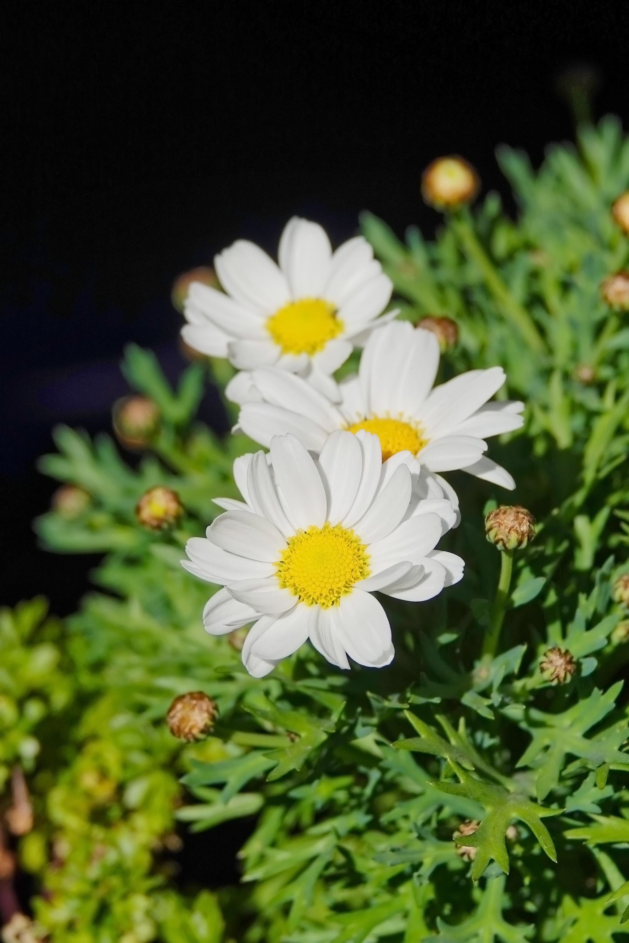 (↓我が家のマーガレットも春の光を満喫中)