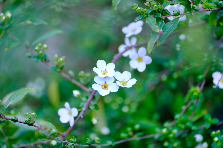 (↓ユキヤナギも花をつけ始めた)