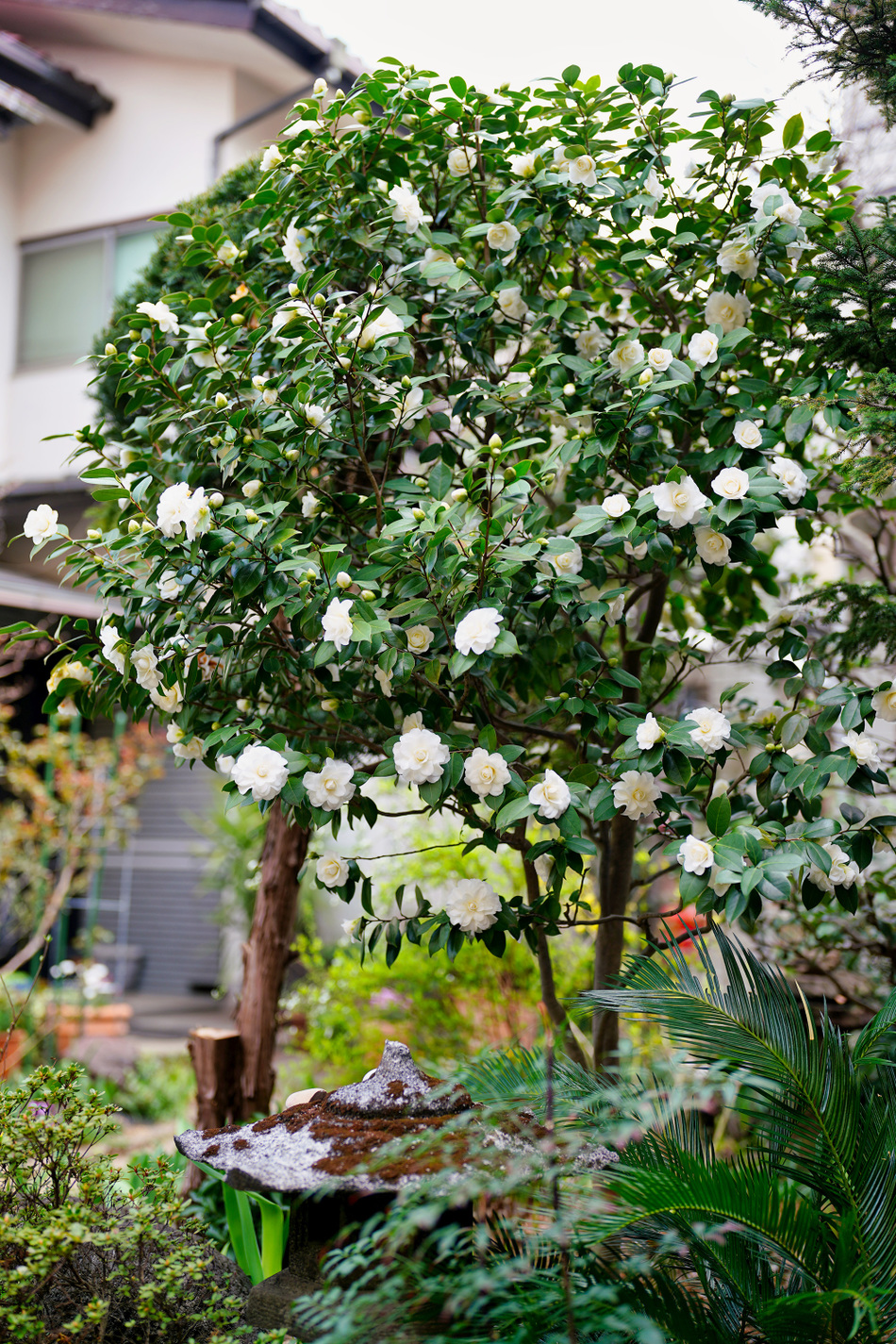(↓我が家自慢の白ツバキもいくつか咲きだした)